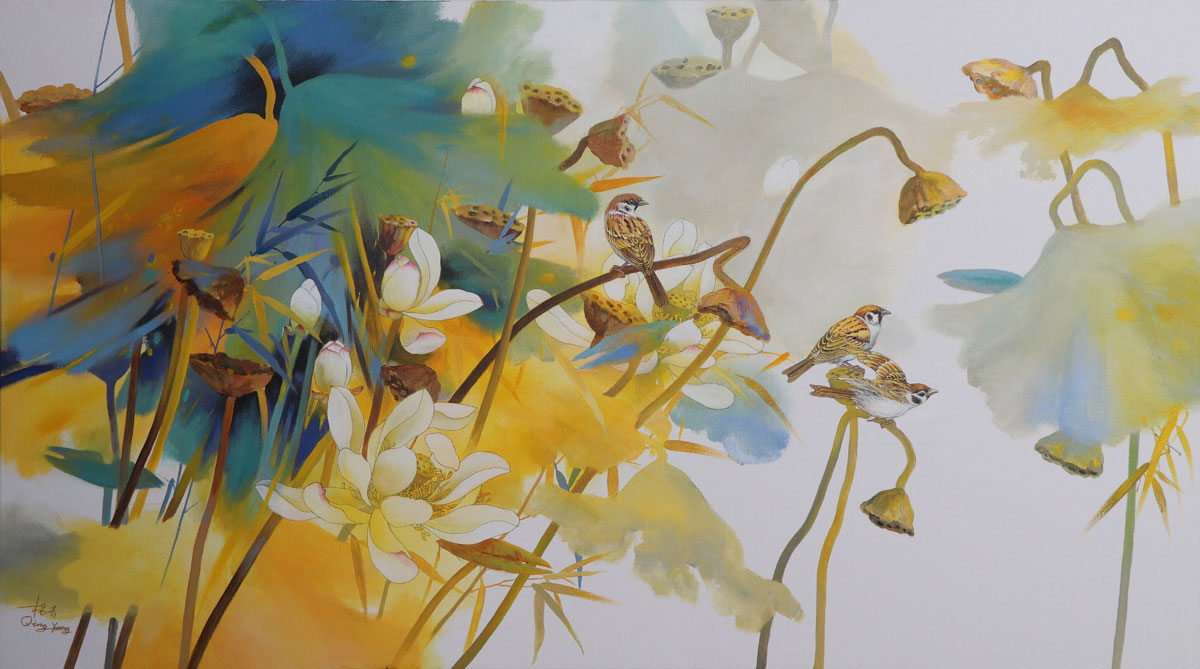 Carefully listening to the flowers’ whispers and enjoying the creating of still life paintings, my focus is on the “Lotus/Water lily” as a subject.